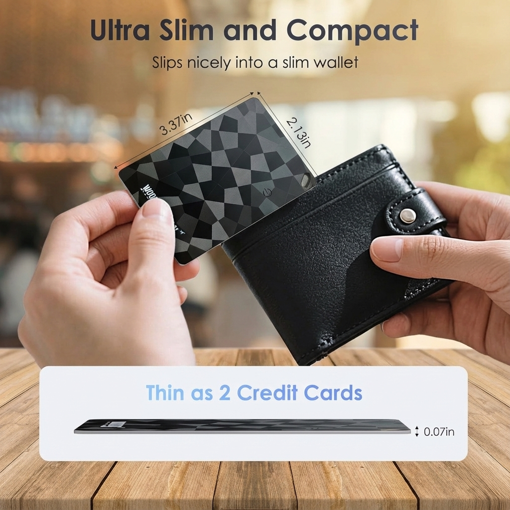 Designed in the exact format of a standard credit card (just 1.8 mm thin), it slides effortlessly into any wallet, passport holder, luggage tag, camera bag, laptop sleeve, or hidden compartment. If a wallet or pocket can hold two stacked bank cards — it can hold this tracker.